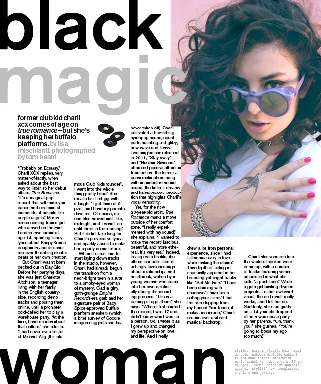 FORMER CLUB KID CHARLI XCX COMES OF AGE ON TRUE ROMANCE—BUT SHE’S KEEPING HER BUFFALO PLATFORMS. BY LISA MISCHIANTI. PHOTOGRAPHED BY TOM BEARD