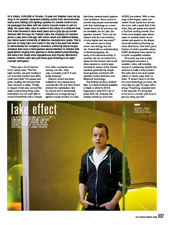 In a small suburb of Toronto, 13-year-old Stephen Lake set up shop in his parents’ basement building robots from deconstructed radios and crafting LED lighting systems for remote control cars. He packaged the latter with his mom’s vacuum sealer to sell on eBay. Ten years later, Lake is seated in the lobby of a midtown New York hotel dressed in dark-wash jeans and a gray zip-up hoodie stitched with the logo for Thalmic Labs, the company he founded about a year and a half ago with Aaron Grant and Matthew Bailey, two fellow recent University of Waterloo mechatronics grads. This is just one of many trips he’s made to the city in the past few weeks to demonstrate his company’s invention, a Minority Report-esque armband that uses a hand-gesture-based interface to interact with applications ranging from gaming to stroke-patient physiotherapy. But before the Today show appearances and Popular Mechanics awards, Thalmic Labs was just three guys tinkering in an open-concept workspace.